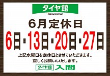 6/20(水)は定休日となります。 宜しくお願いいたします。 タイヤ館入間
