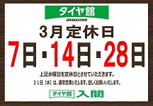 3月は7日・14日・28日の水曜日が定休日となります。 宜しくお願いいたします。 タイヤ館入間