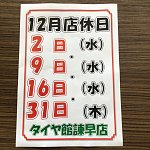 タイヤ館諫早店です!御観覧ありがとうございます(^^♪ 12月の店休日のお知らせです!! お間違いのないようご確認お願い致します! 気になるところがございましたらお気軽にスタッフにお申しつけください(^O^) タイヤ館 諫早店 TEL:0957-21-112