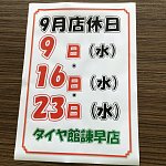 タイヤ館諫早の戸村です!当店のホームぺージをご覧いただきありがとうございます☆彡 9/16は店休日となっておりますのでお間違いのないようお願いします! 急なお車の故障・トラブルご連絡下さい! タイヤ館 諫早店 TEL:0957-21-1120