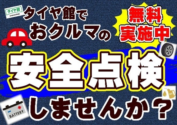 いつもタイヤ館諫早店を ご利用いただきありがとうございます。 タイヤ館諫早店では タイヤの空気圧や溝、傷 エンジンオイルやバッテリーなどの お車の無料安全点検実施中です! 点検時間はおおよそ10分 お出かけ前の安全点検は タイヤ館諫早店へお気軽にお越しください!
