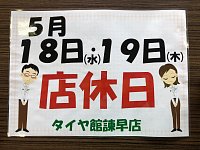 いつもタイヤ館諫早店を ご利用頂き、ありがとうございます! タイヤ館諫早店より店休日の お知らせです。 明日5/18(水)、明後日5/19(木)は 店休日になります。 お客様にはご不便とご迷惑をお掛けいたしますが、ご了承の程、よろしくお願いいたします。 タイヤ館諫早店 諫早市小川町1248 電話:0957-...