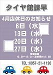 タイヤ館諫早です!当店のホームぺージをご覧いただきありがとうございます☆彡 4月の店休日のお知らせです(^^)/