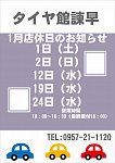 みなさんこんにちはタイヤ館諫早店です(#^^#) 1月の店休日のお知らせです。 お間違いのないようにご確認お願い致します。