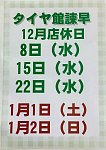 いつもご利用ありがとうございます!タイヤ館諫早です(#^^#) 12月の店休日と年末年始の店休日のお知らせです! お間違いのないようにご確認お願い致します。