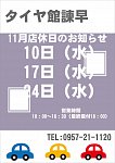 みなさんこんにちは(^^)/タイヤ館諫早です! 本日11/10(水)は店休日となっておりますのでお間違いのないようにご確認お願い致します。