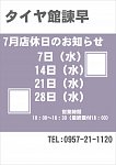 いつもタイヤ館諫早店をご利用頂きありがとうございます(*^^*) 7/21(水)は店休日となっておりますのでお間違いのないようご確認お願い致します。