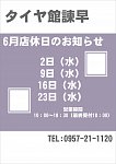 ご観覧ありがとうございます。タイヤ館諫早です! 6/2(水)は店休日となっておりますのでお間違いのないようご確認お願い致します。