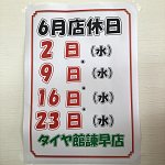 こんにちは!タイヤ館諫早です(#^^#) 6月店休日のお知らせです。 6/2・9・16・23となっておりますので間違えのないようにご確認お願い致します。 タイヤ館諫早 TEL:0957-21-1120