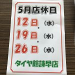 いつもタイヤ館諫早店をご利用いただきありがとうございます(*^^*) 5月店休日のお知らせです!! 5月は12日(水)19日(水)26(水)になっておりますのでお間違いのないようご確認お願い致します。 タイヤ館諫早店 TEL:0957-21-1120