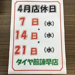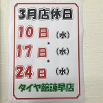 こんにちは!(^^)! タイヤ館諫早店です!3月も残りわずかとなりました。 4月の店休日は4/7日14日21日となっておりますのでお間違えの無いようご確認お願いします! ご来店お待ちしております(*^^*) タイヤ館諫早店 TEL:0957-21-1120