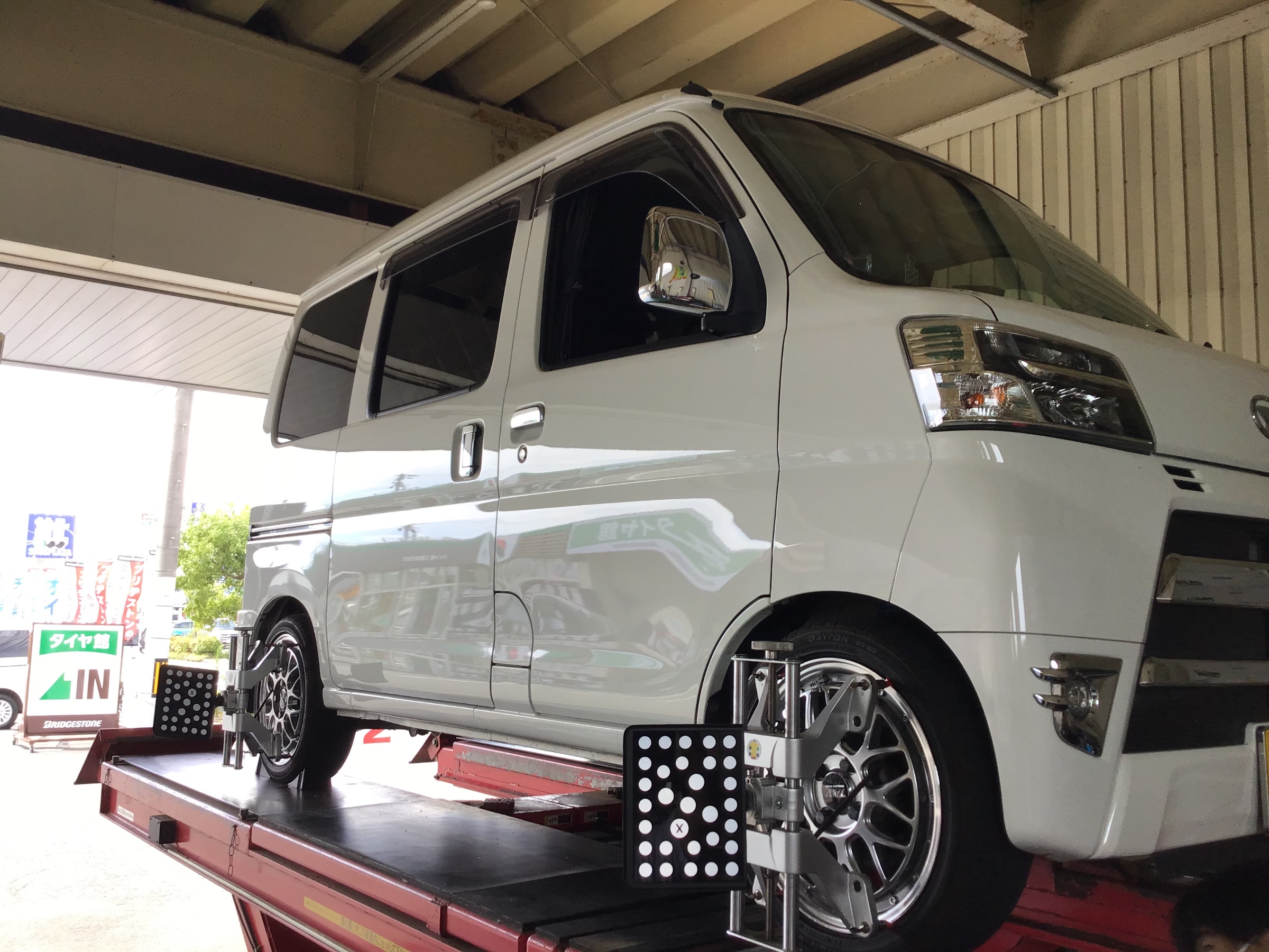 ダイハツ ハイゼット アライメント調整 タイヤ館石巻あけぼの ポスト 2022年8月12日 いつも当店をご利用いただき誠にありがとうございます 本日の作業の一コマ 先月足廻り交換をしたダイハツハイゼットのアライメント調整作業です 先月の大雨の被害があった地域のお客様で作業が延期となっていました 何とか作業できてよかったです、フロント2か所を調整、滞りなく終了