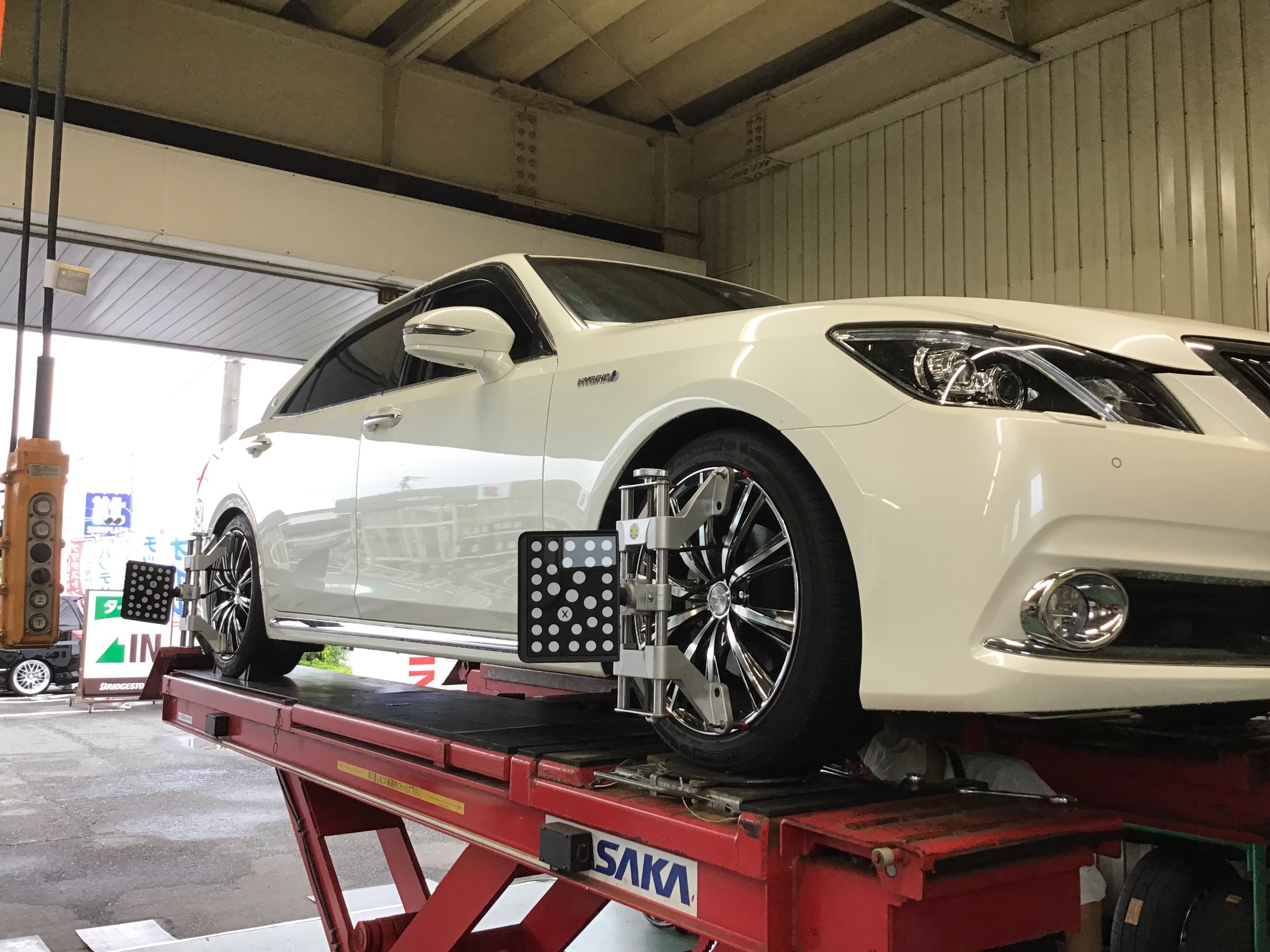 トヨタ クラウンマジェスタ アライメント調整 タイヤ館石巻あけぼの ポスト 2022年8月31日 いつも当店をご利用いただき誠にありがとうございます 早いもので8月も最終日、 来月からのタイヤ値上げもあり、例年以上に忙しい8月になりました ありがとうございます‼ そんな本日の作業の一コマ いつも当店をご利用いただいている修理工場さんからの依頼で トヨタ マジェスタのアライメント調整作業です フロント・リアの6ヶ所を基準値に調整し、予定時間内で終了