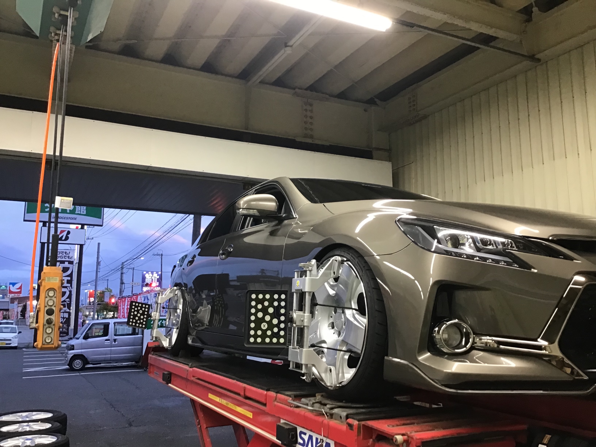 トヨタ マークX アライメント調整 タイヤ館石巻あけぼの ポスト 2022年10月8日 いつも当店をご利用いただき誠にありがとうございます 本日の作業の一コマ いつも当店をご利用いただいているカーショップさんからの依頼で トヨタ マークXのアライメント調整作業です(エアサス装着) フロント・リアの4ヶ所を調整、滞りなく終了。