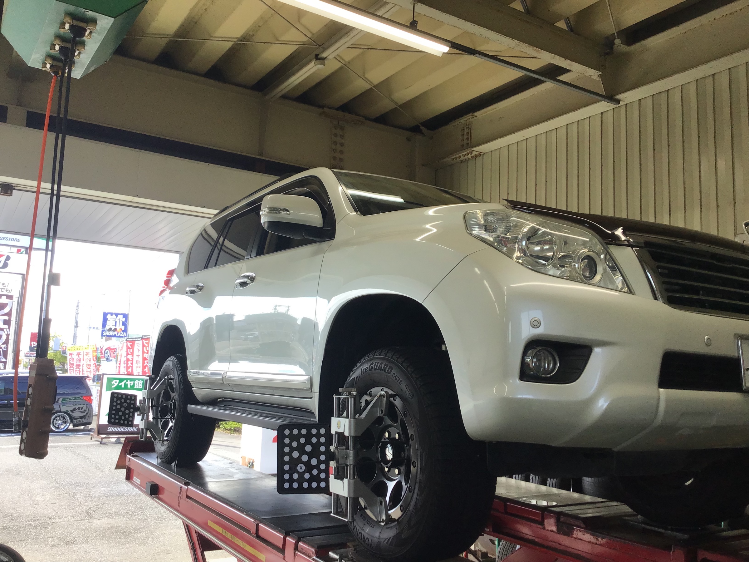 トヨタ ランクルプラド アライメント調整 タイヤ館石巻あけぼの ポスト 2022年10月16日 いつも当店をご利用いただき誠にありがとうございます 本日の作業の一コマ トヨタ ランクルプラドのアライメント調整作業です アルミホイールが大口径すぎて、センサーが取り付け出来ず急遽冬タイヤをもってきてもらい 作業開始 フロント6か所フル調整&リアのラテラルロッドを調整、少し時間がかかりましたが何とか終了