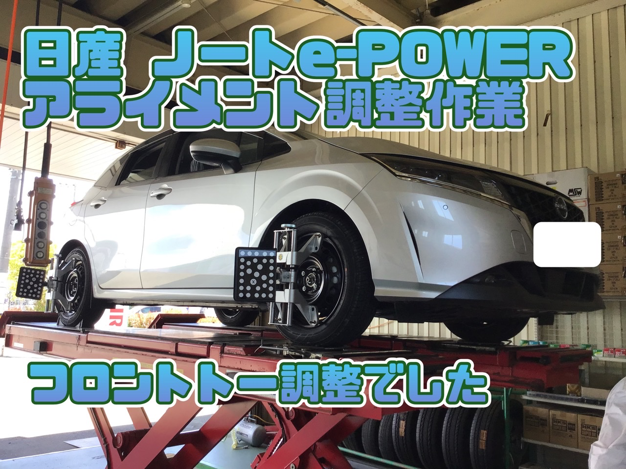 日産 ノートe-POWER アライメント調整 タイヤ館石巻あけぼの ポスト 2023年6月3日 いつも当店をご利用いただき誠にありがとうございます 本日の作業の一コマ いつも当店をご利用いただく修理工場さんからの依頼で 日産 ノートe-POWERのアライメント調整作業です フロント2か所を調整、滞りなく終了。 本日はありがとうございました。