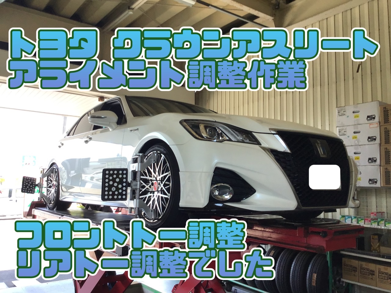 トヨタ クラウンアスリート アライメント調整 タイヤ館石巻あけぼの ポスト 2023年6月14日 いつも当店をご利用いただき誠にありがとうございます 本日の作業の一コマ トヨタ クラウンアスリートのアライメント調整作業です フロント・リアの4ヶ所を調整、滞りなく終了。 他店ですが車高調の取り付けをやったようでその後の調整作業でした 本日はありがとうございました