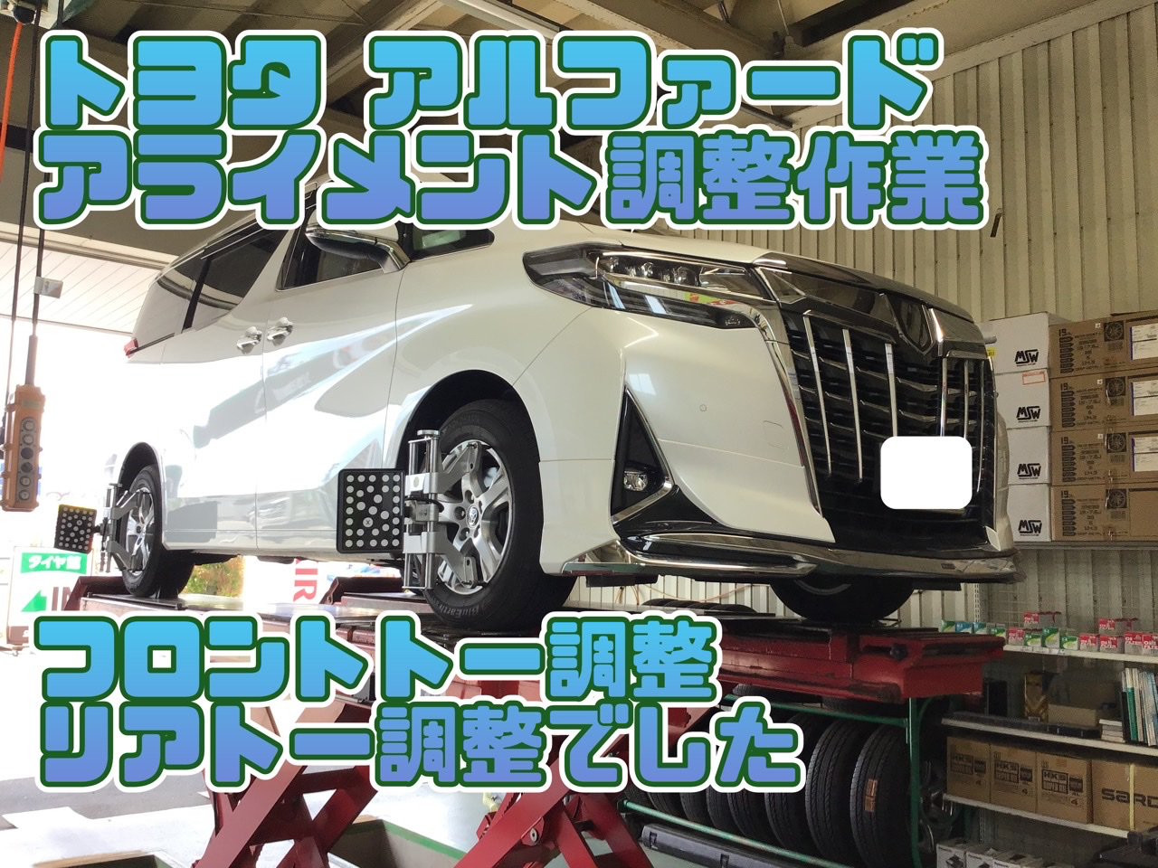 トヨタ アルファード アライメント調整 タイヤ館石巻あけぼの ポスト 2023年6月15日 いつも当店をご利用いただき誠にありがとうございます 本日の作業の一コマ いつも当店をご利用いただく修理工場さんからの依頼で トヨタ アルファードのアライメント調整作業です フロント・リアの4ヶ所を調整、滞りなく終了。 本日はありがとうございました。