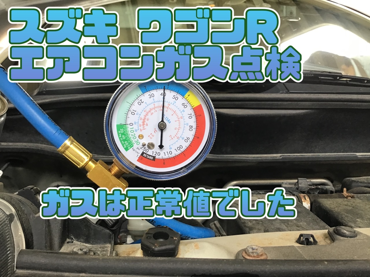 スズキ ワゴンRのエアコンガス点検作業です。連日の暑さで増えてきました。