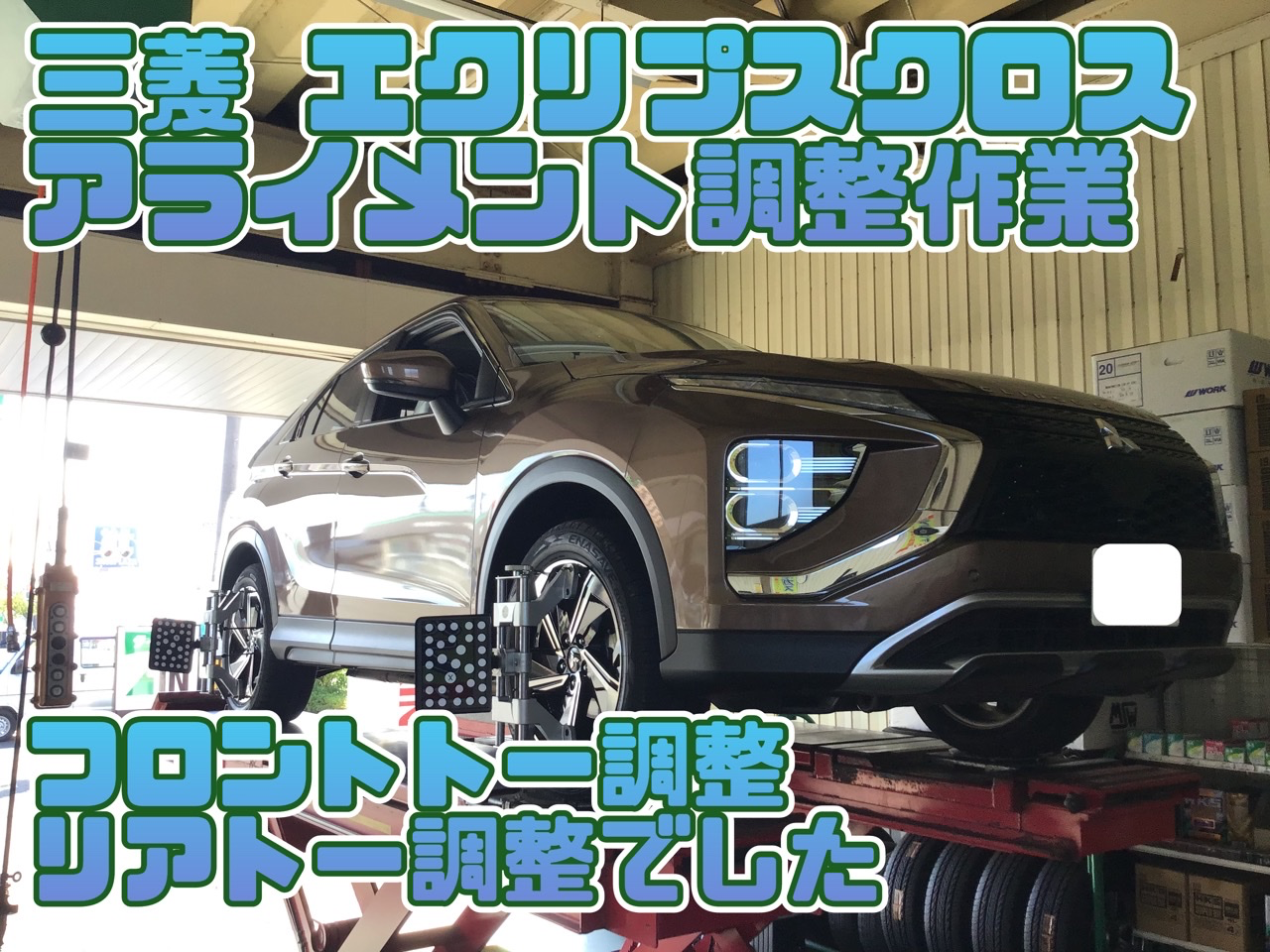 三菱 エクリプスクロス アライメント調整 タイヤ館石巻あけぼの ポスト 2023年9月2日 いつも当店をご利用いただき誠にありがとうございます 本日の作業の一コマ いつも当店をご利用いただく修理工場さんからの依頼で 三菱 エクリプスクロスのアライメント調整作業です フロント・リアの4ヶ所を調整、滞りなく終了。 本日はありがとうございました。
