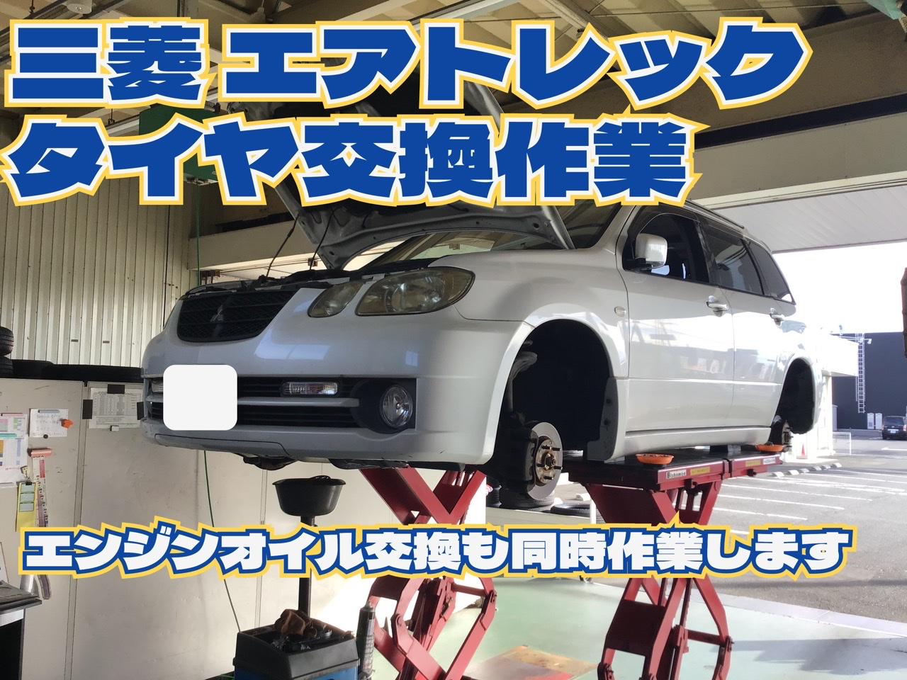 三菱 エアトレックのタイヤ交換作業です(エンジンオイル交換も同時作業)
