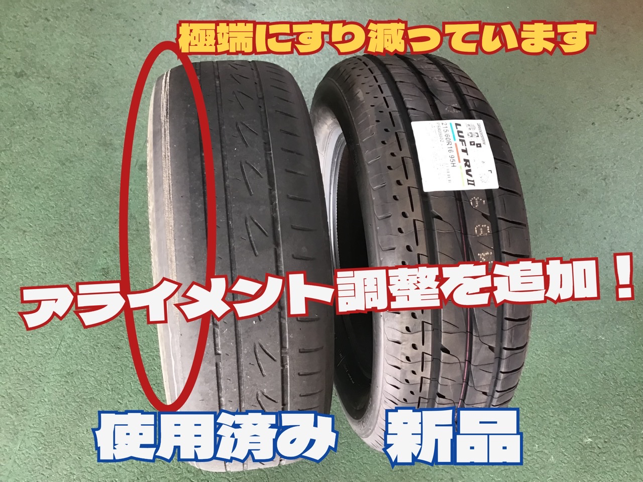 タイヤの状態をお客様に確認してもらいアライメント調整作業を追加しました