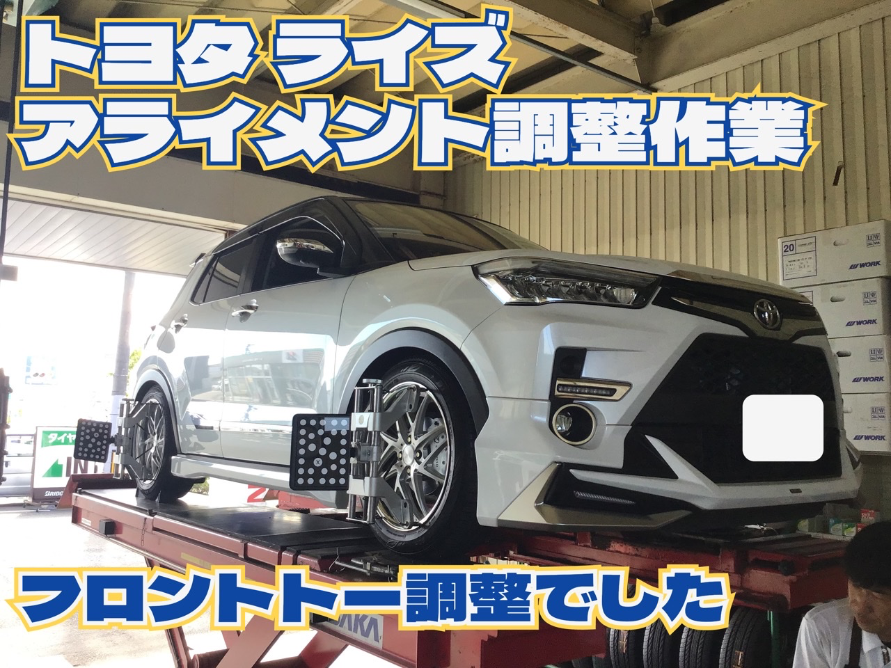 トヨタ ライズ アライメント調整 タイヤ館石巻あけぼの ポスト 2023年9月24日 いつも当店をご利用いただき誠にありがとうございます 本日の作業の一コマ いつも当店をご利用いただくカーショップさんからの依頼で トヨタ ライズのアライメント調整作業です(エアサス装着) こちらはフロント2か所の調整でした 本日はありがとうございました。