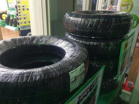 タイヤに ポスト 2015年10月13日 晴れてるのに雨が降ってきたり今日は変な天気ですね。ここ最近風が強かったり、雨が降ったりが多いので展示しているタイヤにラッピングしてみました。試しに巻いてみたのでまだ一部分しか出来てませんがきれいな状態で購入いただけるよう早急に完了させてたいと思います。ホントは巻き巻き作業しているところをアップしたかったのですが誰も撮ってくれなかったので巻き終えたタイヤ画像をアップします(涙) 担当:自撮り棒買おうかな・・・