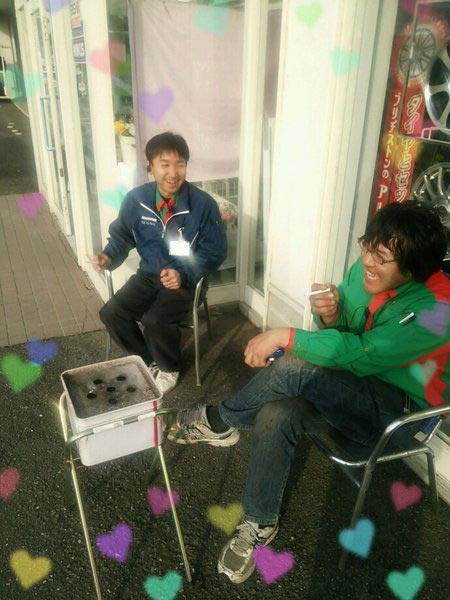 当番がやっときたぁぁぁぁぁあっぁぁぁぁぁぁぁぁぁ!!! 私が当番を割り振っているんだけどなあ。 なんかすごい長く日が空いちゃった ポスト 2015年3月22日 こんにちはノ暖かい日が続いているので釣りに行きたいなと思っている齋藤ですノ昨日和希さんが何やら椅子を水洗いしてました!どこに設置するのかなー??なんて思ってたら!!!??外の喫煙所!店長と晃さんが楽しく談笑中!?笑タイヤ交換の待ち時間などにぜひこのように(二枚目)お使いくださいノ 担当:齋藤