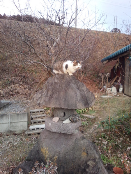 神様!!仏様"猫様?? ポスト 2016年1月9日 こんにちは 親父の岡田です。昨日の話しになりますが休みをいただいたので久しぶりに家のまわりを、かたづけ方をしていると何時もの住みついた猫様が現れ今回は何とう家神の前にあるトウロウノ上から現場監督で私を見守ってくれています今年一年見守ってくれるかな??遅くなりましたが今年の家族の祈願祭に午前中に行ってきましたけがなく、事故なく、仕事かできますよに。 担当:岡田