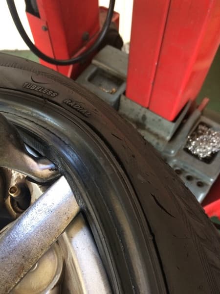 バーストしてしまったタイヤは、何が原因だったか判別できないくらい損傷して