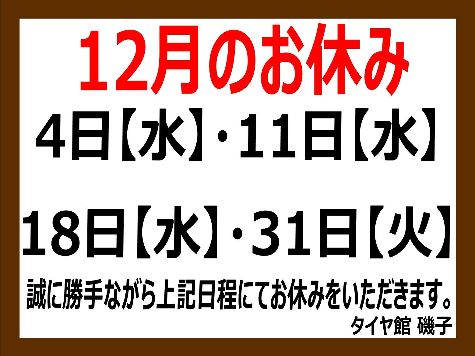 12月の定休日のお知らせです。