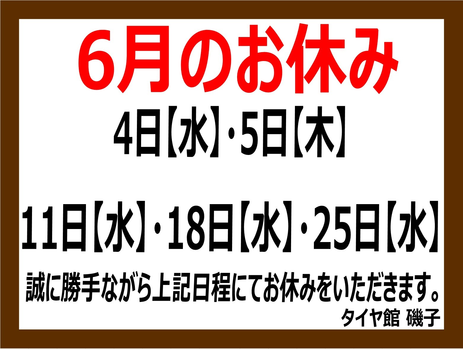 【6月】定休日のお知らせ 2025年5月29日 いつもタイヤ館磯子のHPをご覧いただき 誠にありがとうございます。 6月の定休日のお知らせです。 第1週目の4日(水)・5日(木)は2連休となっております。 ご不便をおかけ致しますが宜しくお願い致します。