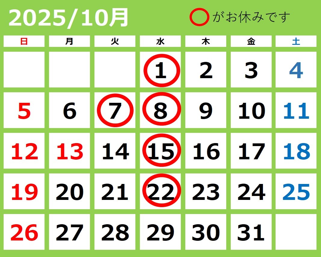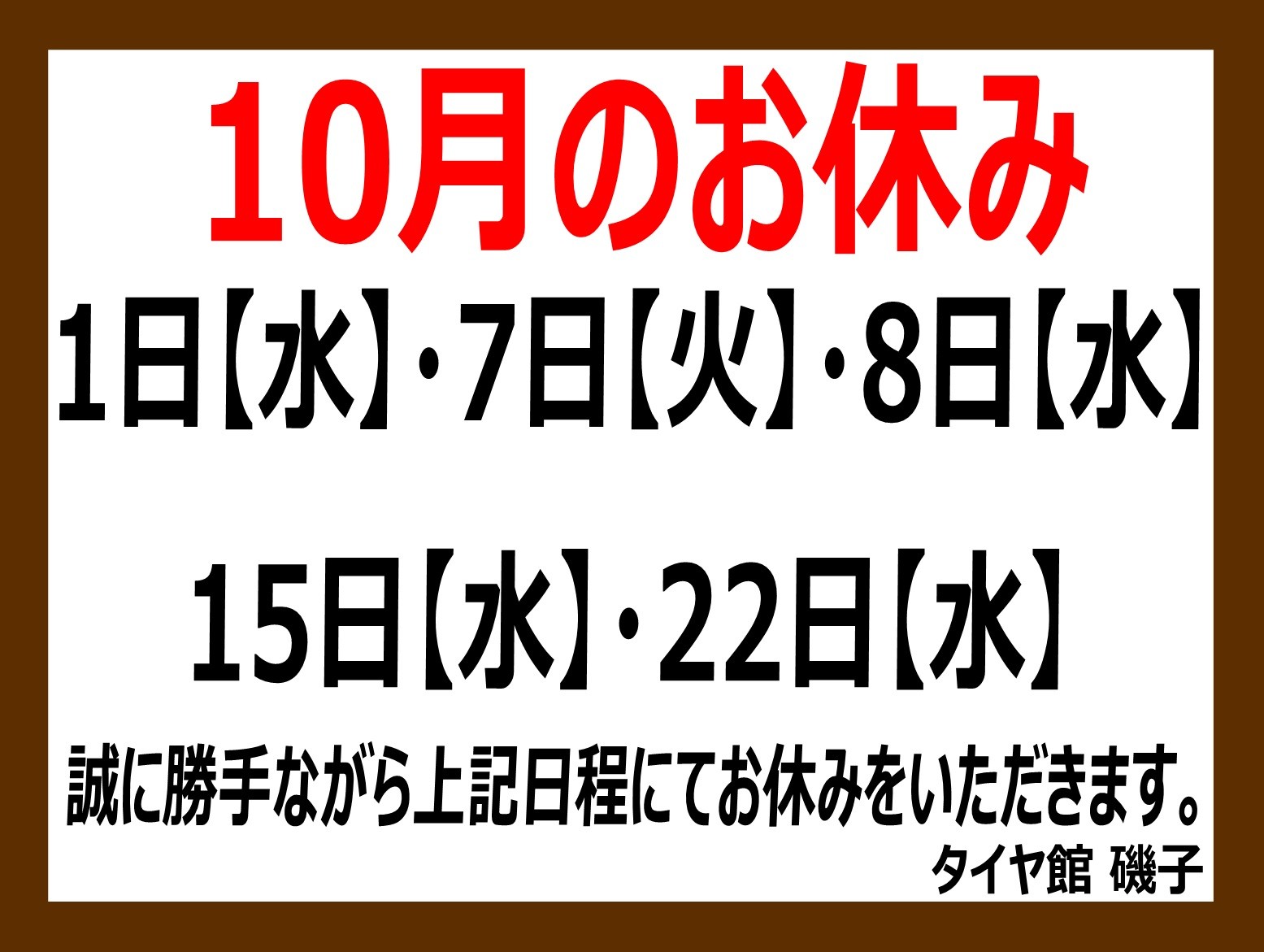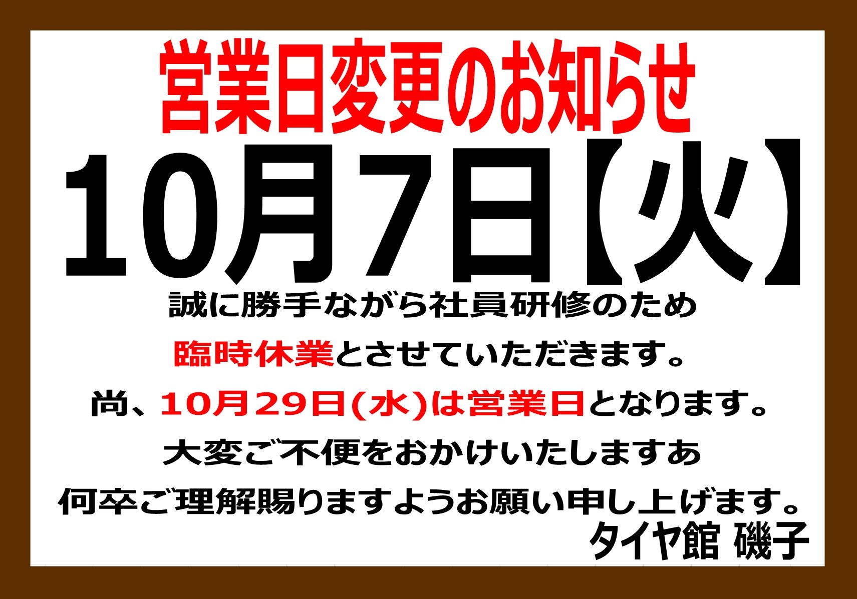 【10月】定休日のお知らせ 2025年9月23日 いつもタイヤ館磯子店をご利用いただき 誠にありがとうございます。 10月の定休日のお知らせです。 7日(火)は社内研修のため臨時休業とさせていただきます。 29日(水)は水曜日ですが営業日となりますので よろしくお願いいたします。