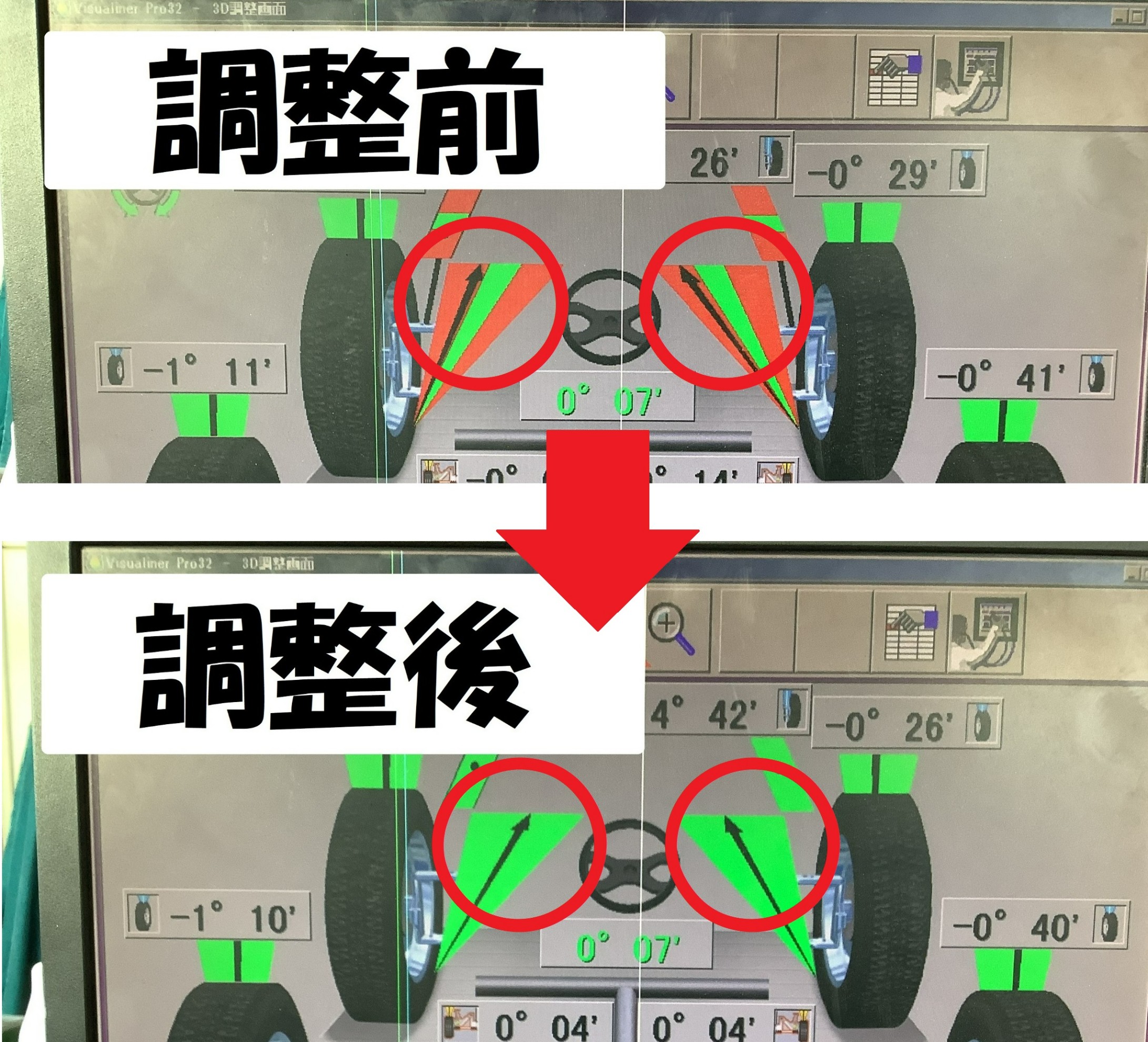 車両を正面から見た時のタイヤの角度(ハの字・またはその逆)