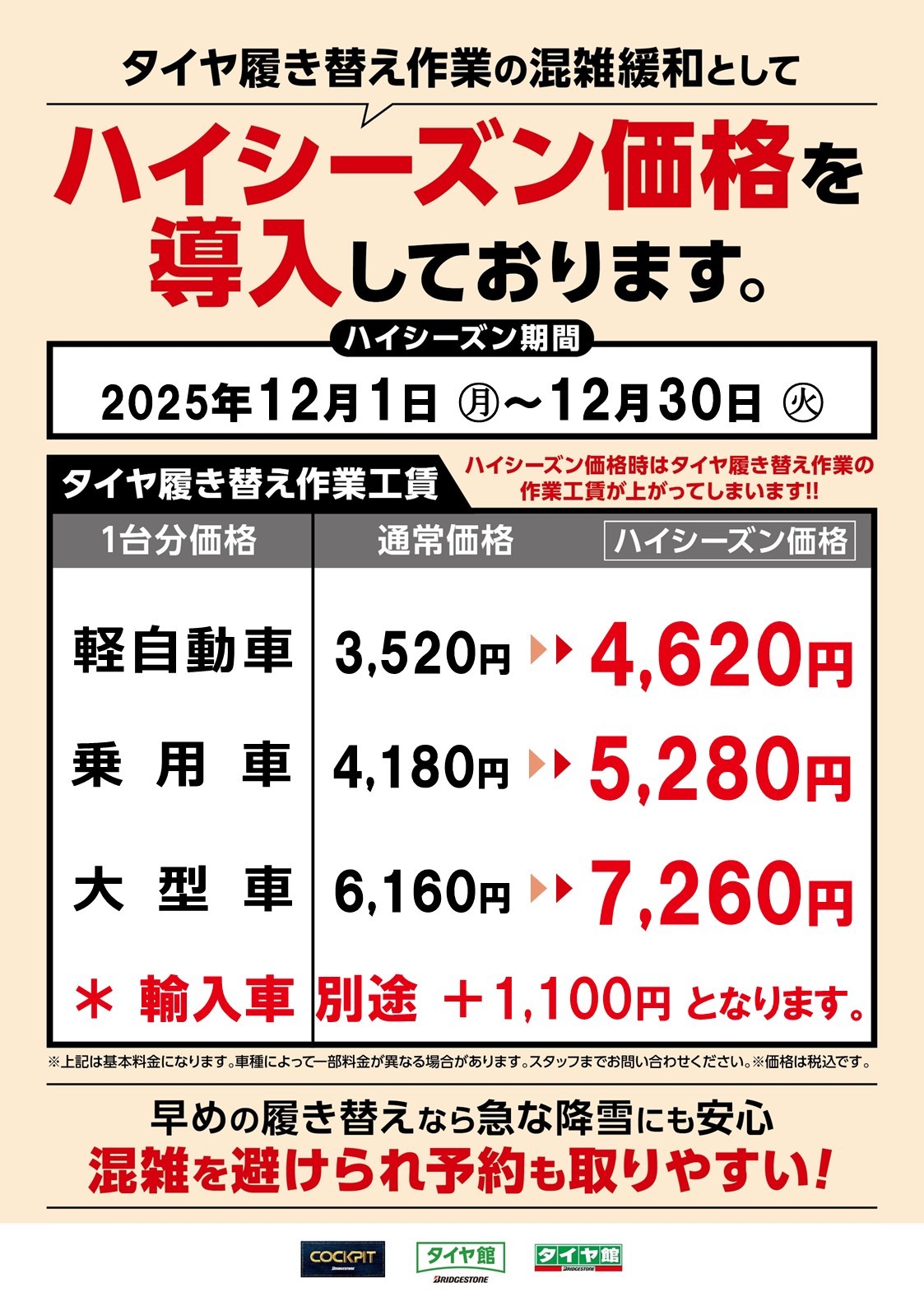 12月お履き替えハイシーズン価格のお知らせ