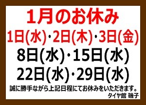1月定休日のお知らせ ポスト 2020年1月1日 あけましておめでとうございます! 本年もどうぞ変わらぬご愛顧のほどよろしくお願い致します。 タイヤ館磯子では、下記の通り定休日を設定しております。 1/1(水)・2(木)・3(金)・8(水)・15(水)・22(水)・29(水) 当日は、お電話でのお問い合わせも承っておりませんので、お気を付けください。 また、2020年1月より営業時間を変更しております。 全日 10:30~19:00(最終受付 18:30) 水曜不定休 ご不明点などございましたら、お気軽にスタッフまで。 お電話でのお問い合わせも承っております。 カテゴリ:お知らせ