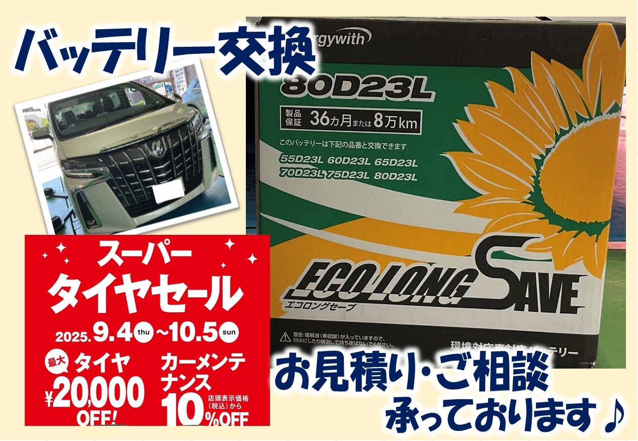 いつもタイヤ館磯子店のHPをご覧いただき 誠にありがとうございます。 ★スーパータイヤセール10/5まで★ セール終了まで残り4日となりました。 バッテリー含むカーメンテナンスとタイヤ購入がお得に! ぜひこの機会をお見逃しなく(*'▽')/ 秋に起きやすいお車のトラブルのひとつ バッテリートラブル ...