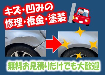 いつもタイヤ館磯子店のHPをご覧いただき 誠にありがとうございます。 「うわ・・やっちゃった・・・」 車にできたキズ・凹みなどの修理を どこに相談しらいいかお困りでしたら是非タイヤ館磯子店へ♪ タイヤ館でも板金・塗装・修理も承っております!! 無料お見積りは予約なしでもOK ちょっとした擦...