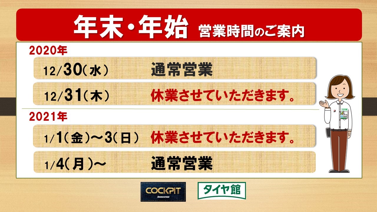 年末年始営業時間のご案内 ポスト 2020年12月26日 いつもタイヤ館板橋店をご利用いただき誠にありがとうございます。 当店より、年末年始の営業時間のお知らせをいたします。 本年度の営業日は12月30日(水)までとなっております。 お車の準備は早めに済ませてくださいますようお願い申し上げます。 12月31日(木)~1月3日(日)は休業とさせていただきます。 皆様にはご迷惑をおかけしますが、何卒ご理解の程よろしくお願い申し上げます。 カテゴリ:お知らせ