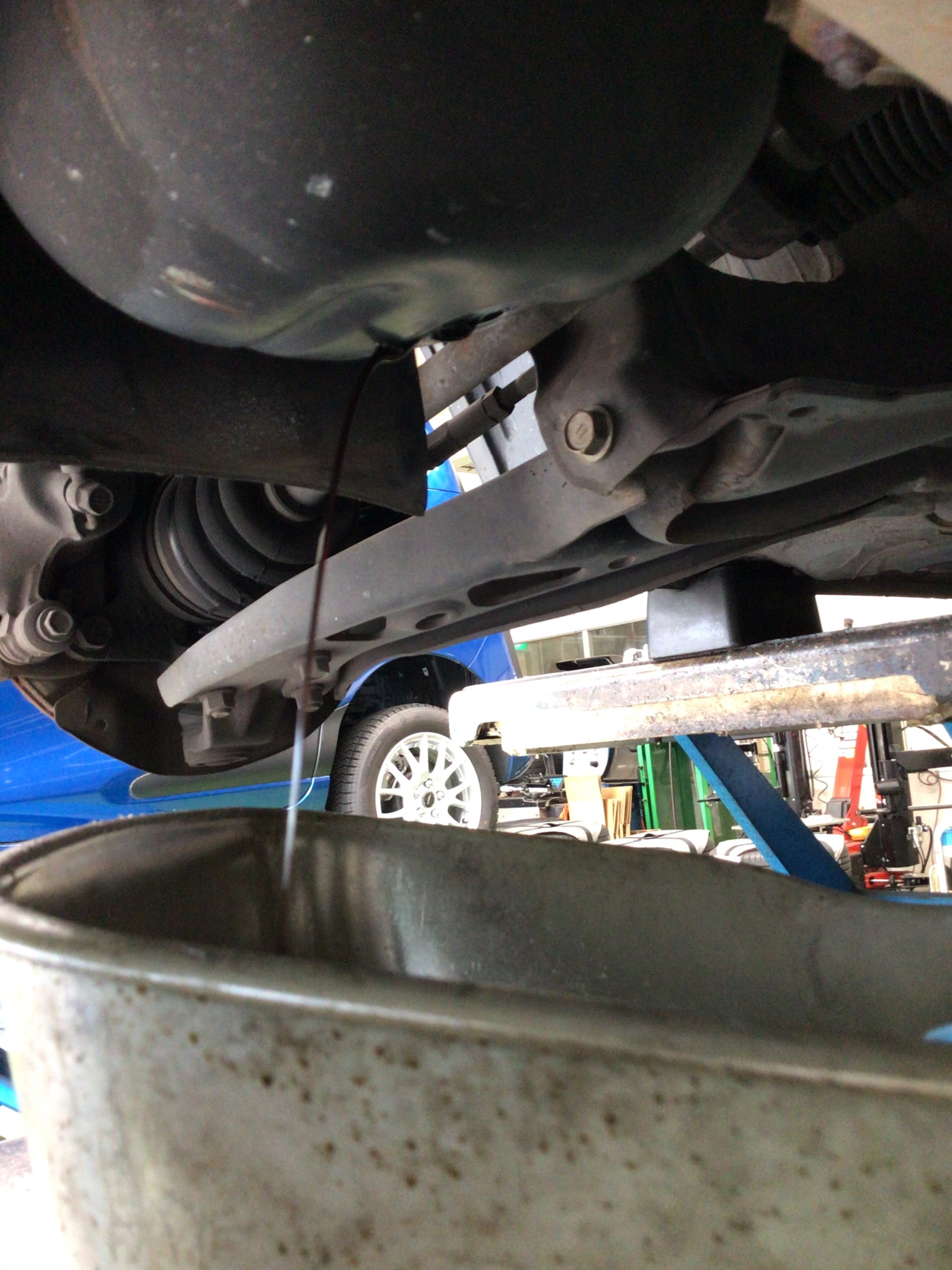 愛車のエンジンオイル交換もお気軽にお声かけて下さい。写真はオイル交換風景です。