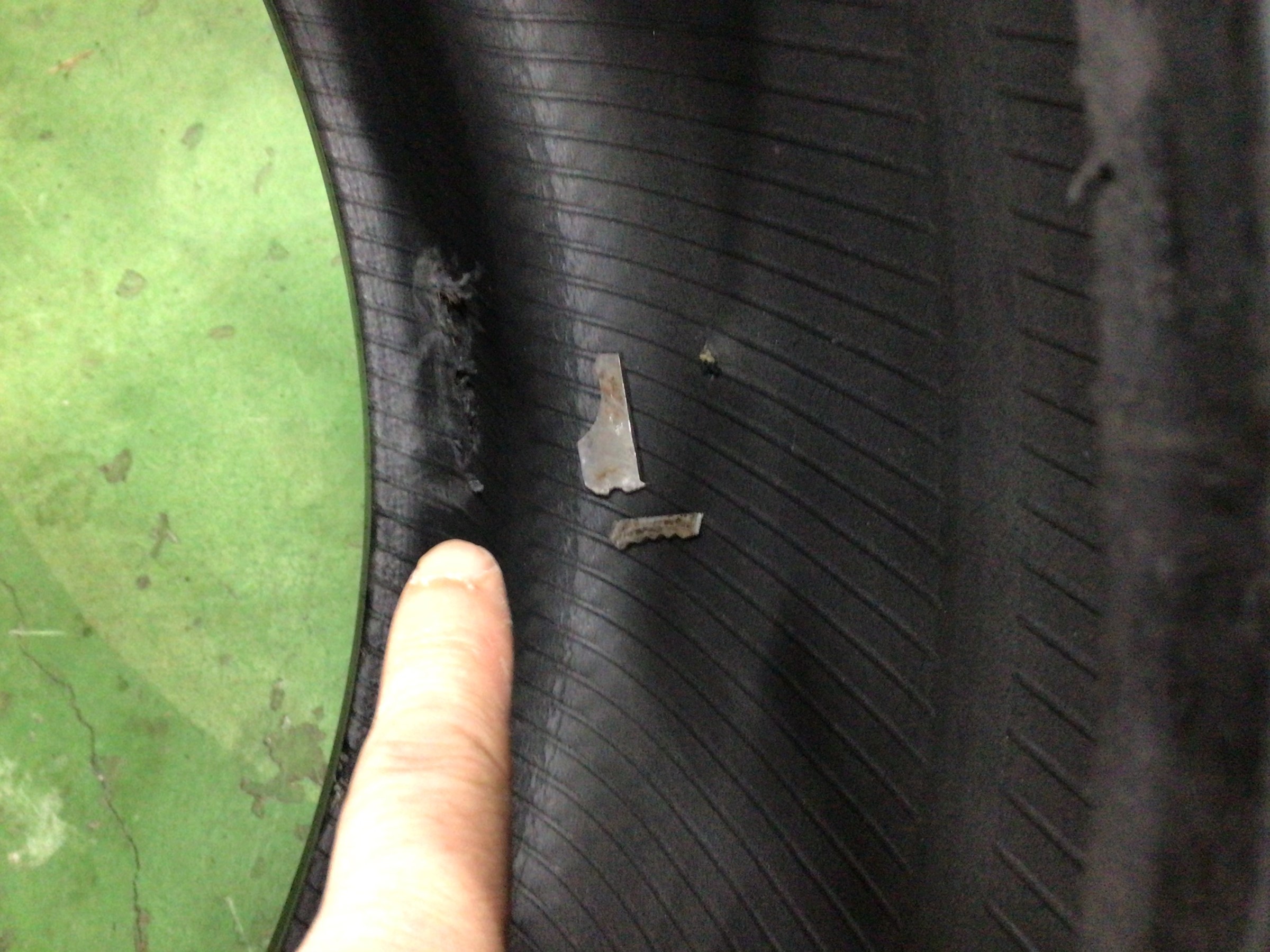 傷以外にもタイヤの内側(ちょうど指と金属片の間)に”シワ”が付いているの見えますか?