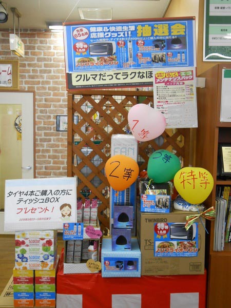 ただいま、タイヤ4本(税込¥32400以上)お買い上げのお客様に