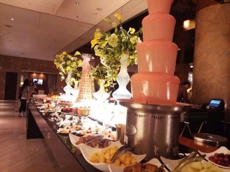 上の娘はデザートコーナーにあったいちご味のチョコレートファウンテンに