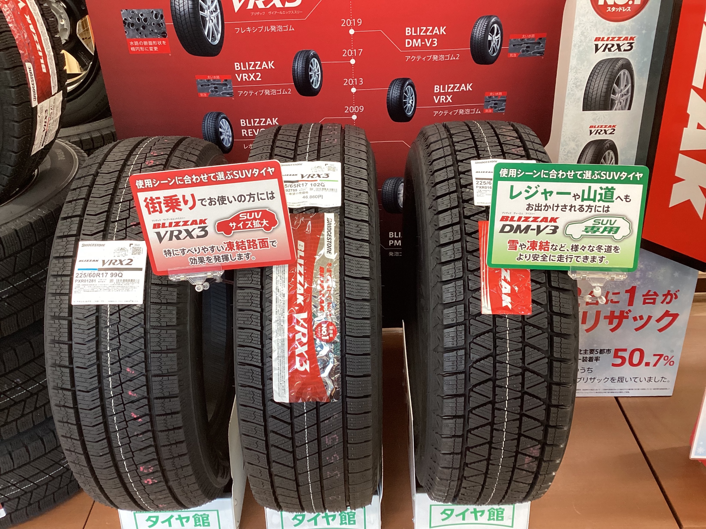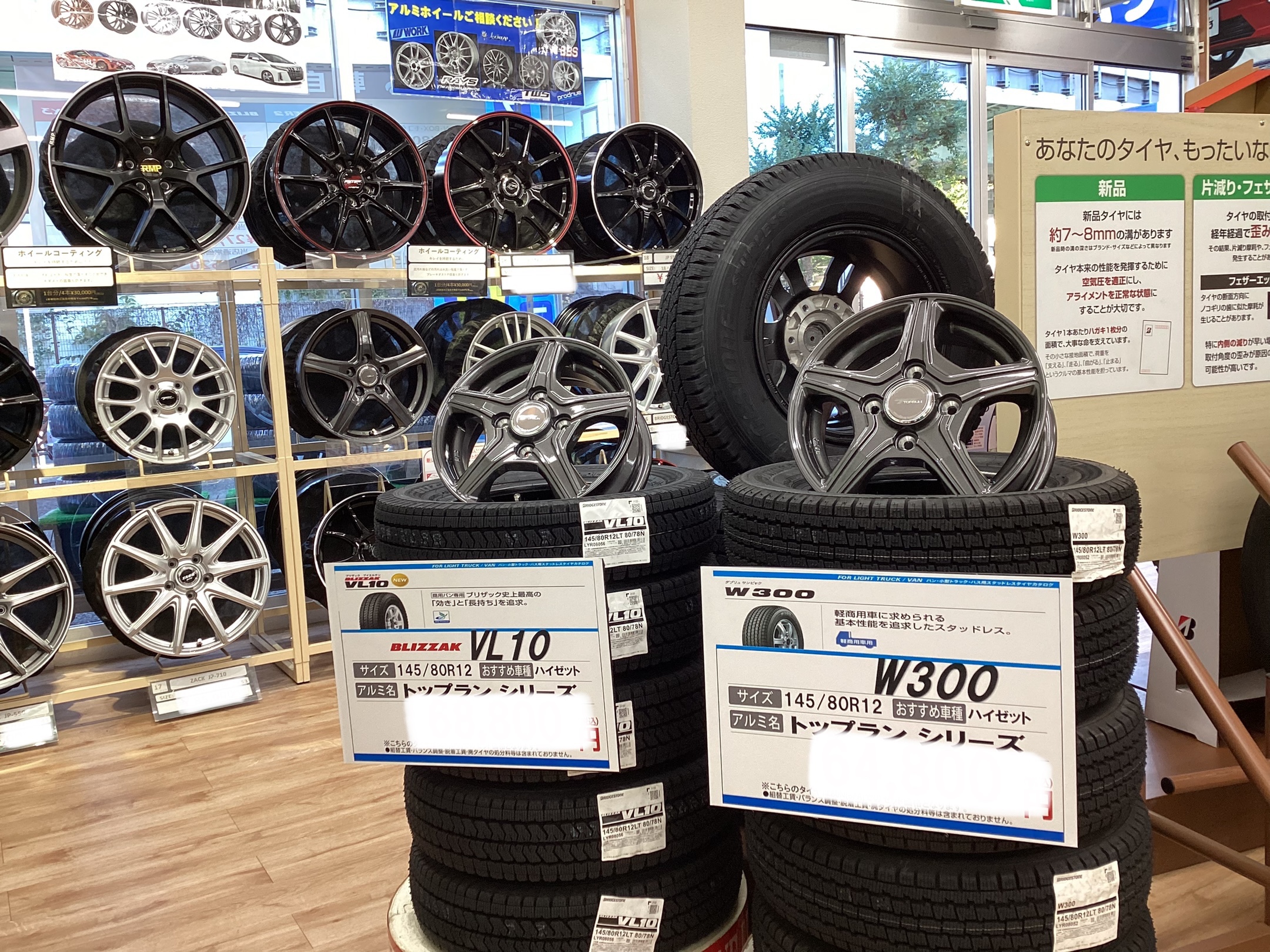 お客様をお出迎えする入口からスタッドレスタイヤがバーン!と目に飛び込んでくる展示にしました!