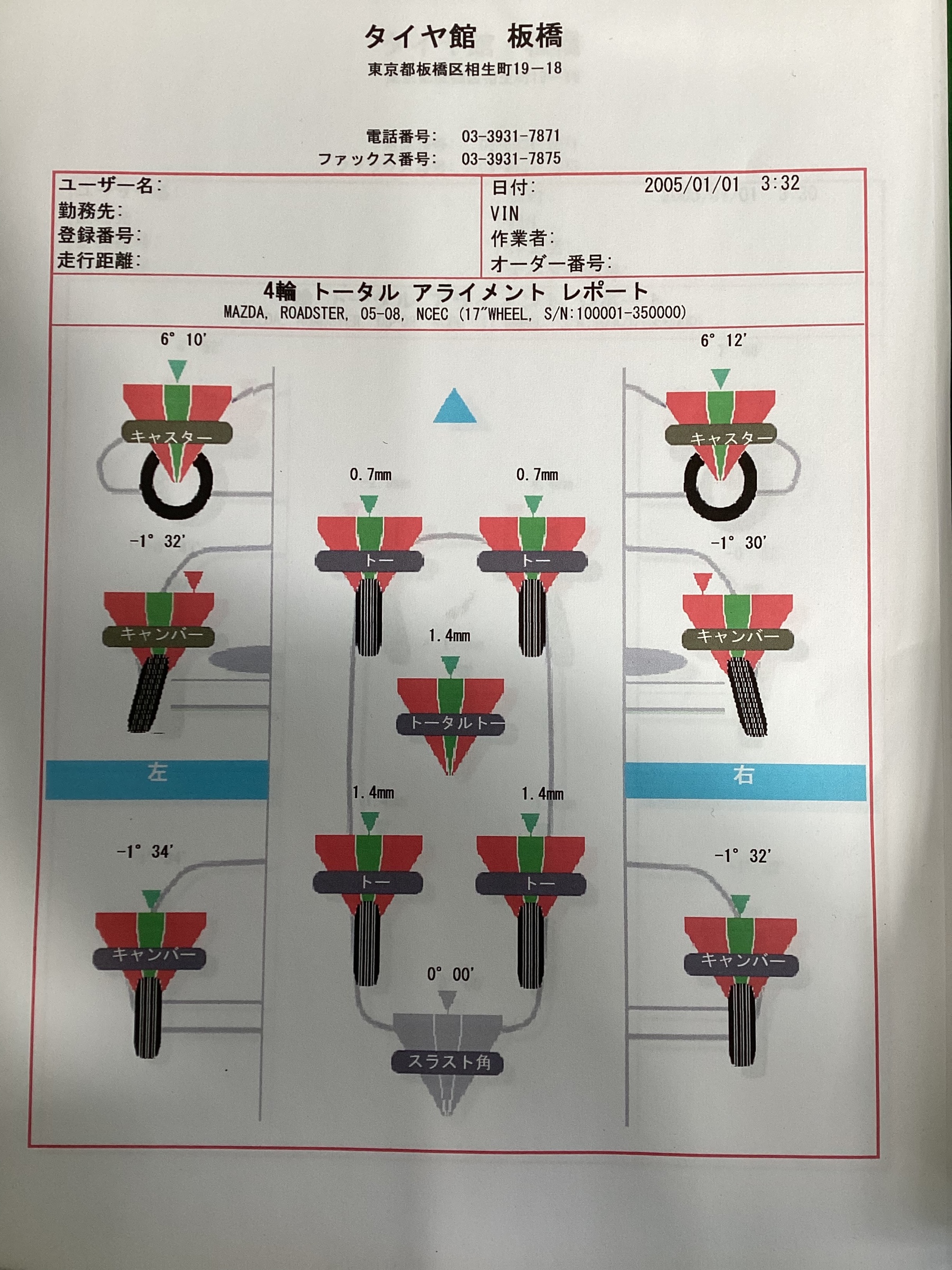 フロントトーやキャンバー角に異常はないので、これが原因のようです。