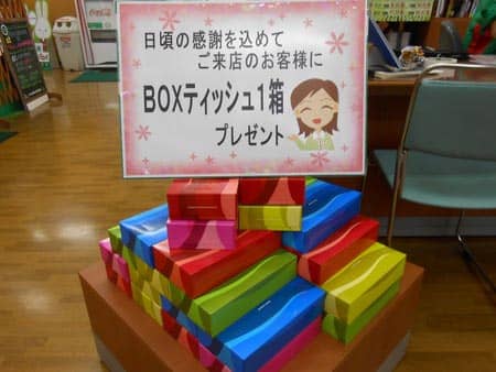 今週末限定でご来店のお客様全員にBOXティッシュ差し上げます。
