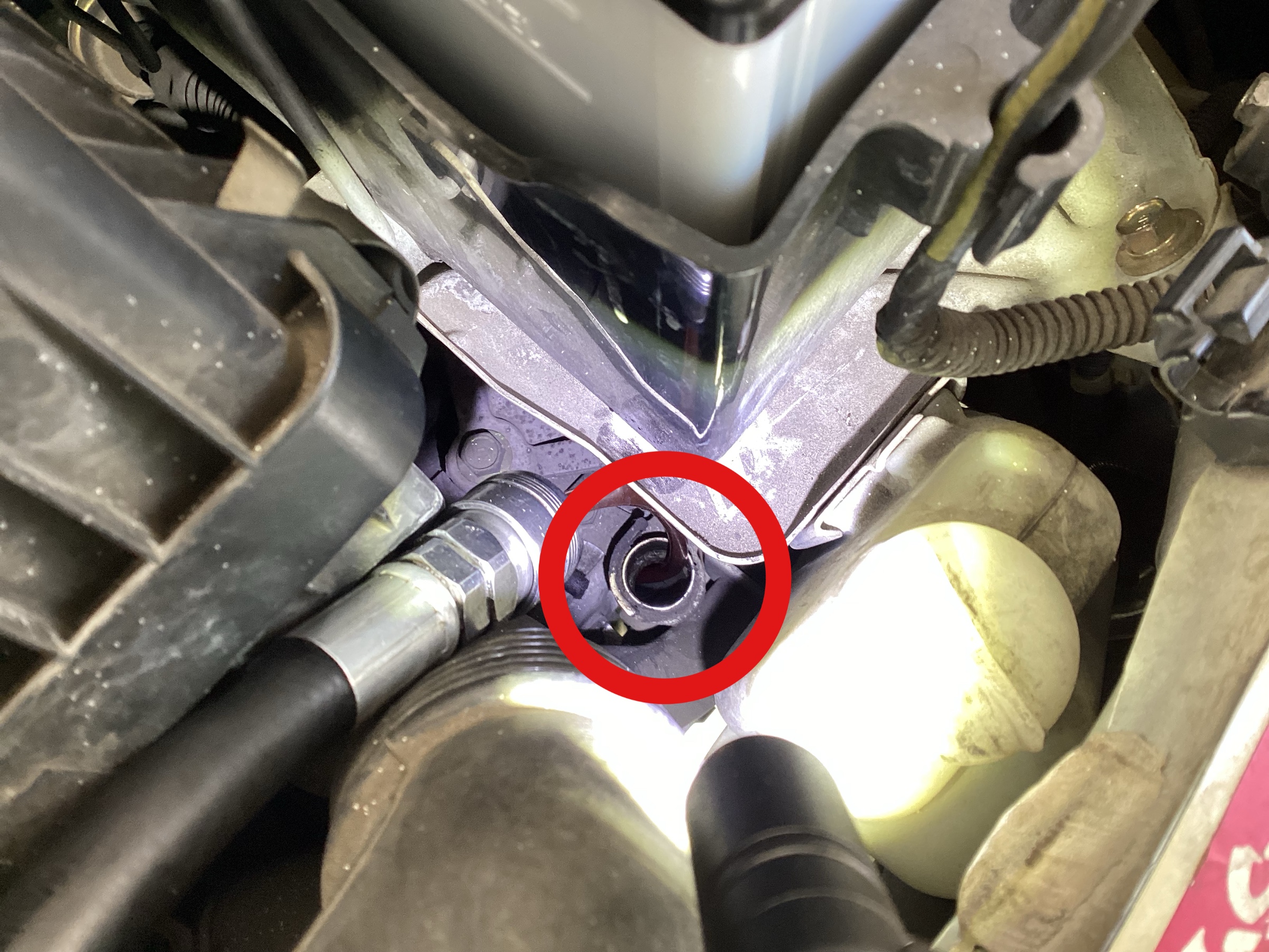 画像の赤丸の部分に差し込んで、オイルを抜きます。
