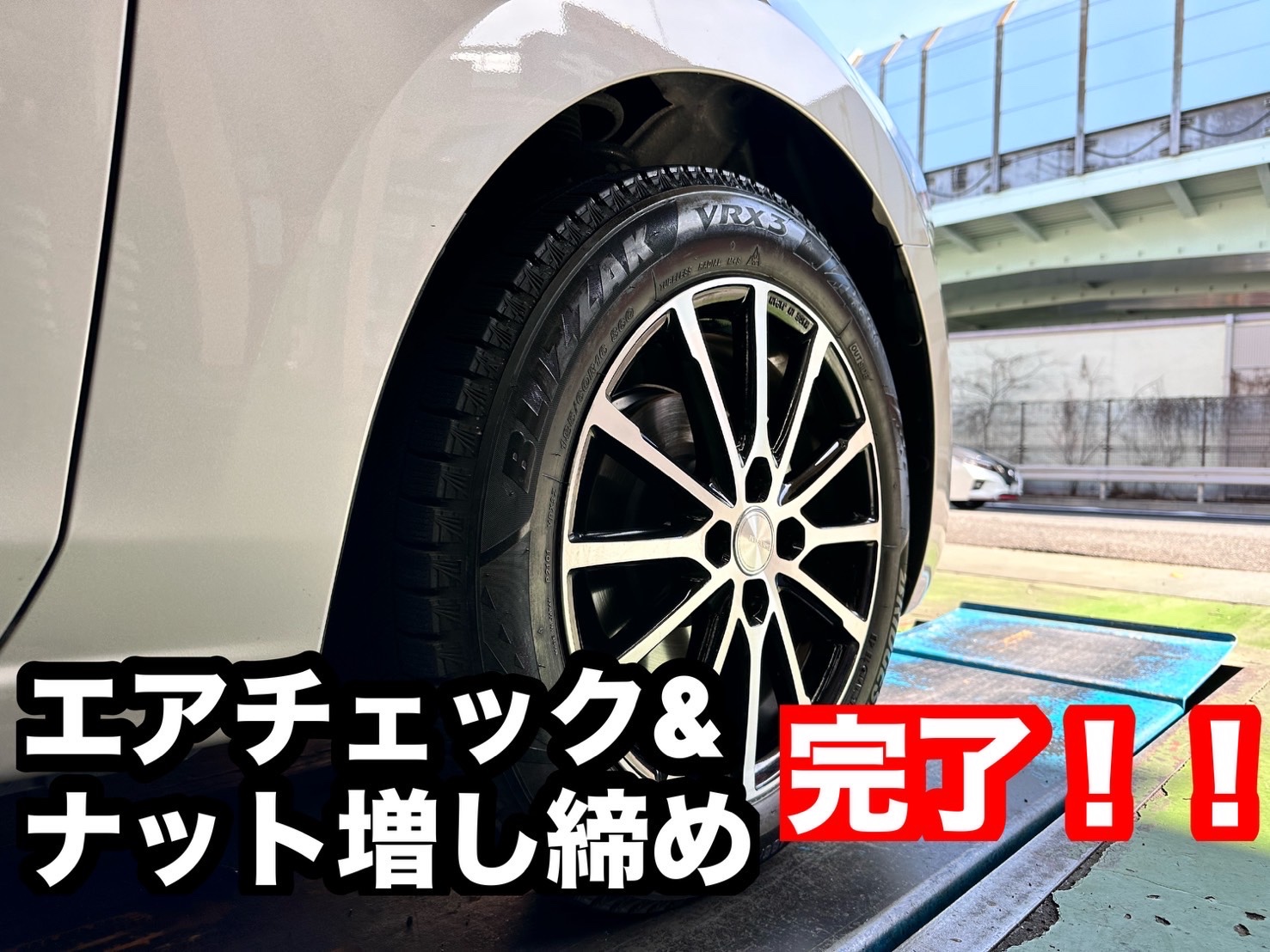 タイヤを購入されたお客様には、アフターフォローとして、100kmの走行をめどに空気圧点検とあわせてホイールナットの再確認(増し締め)を無料で実施しています。