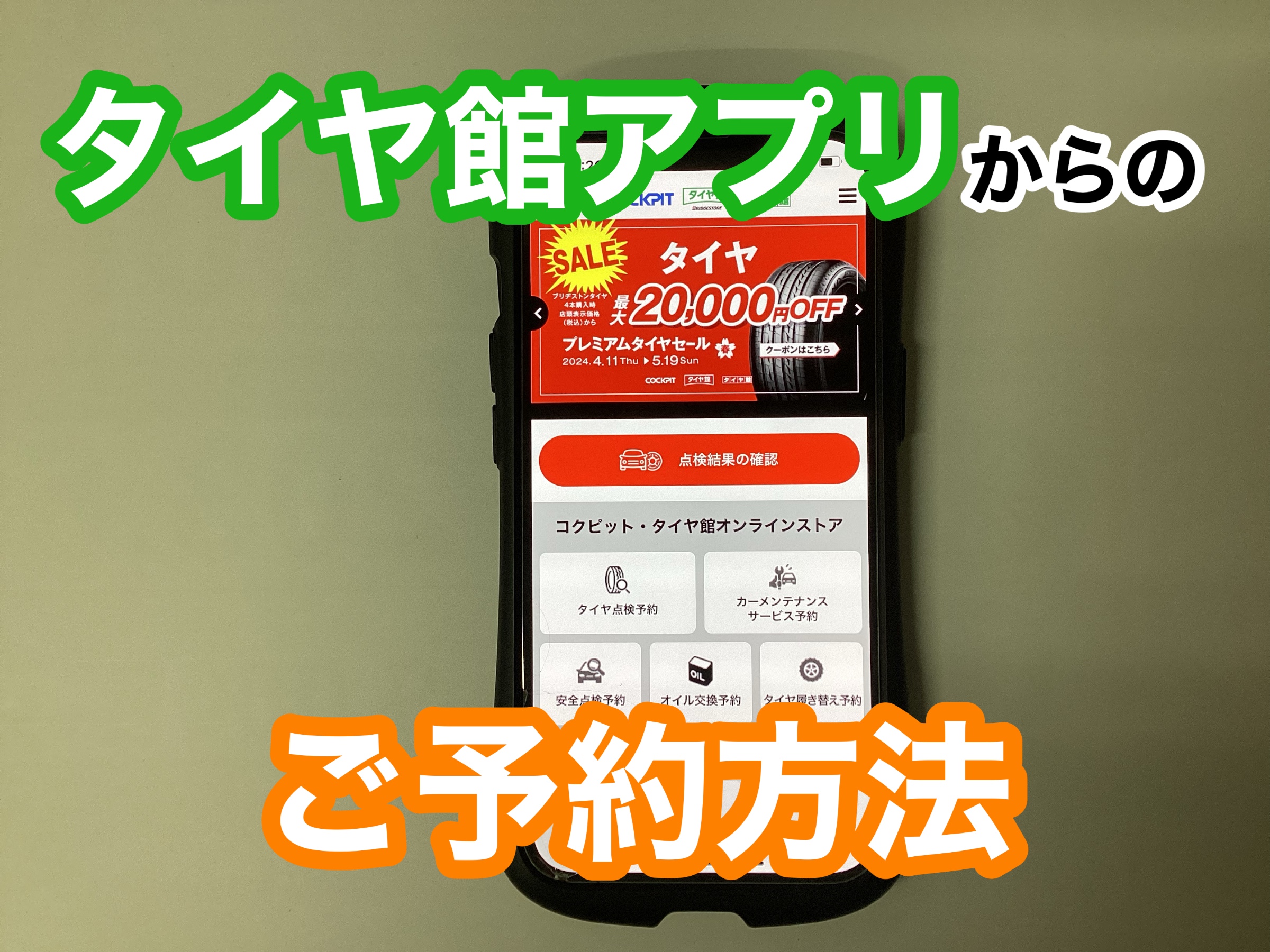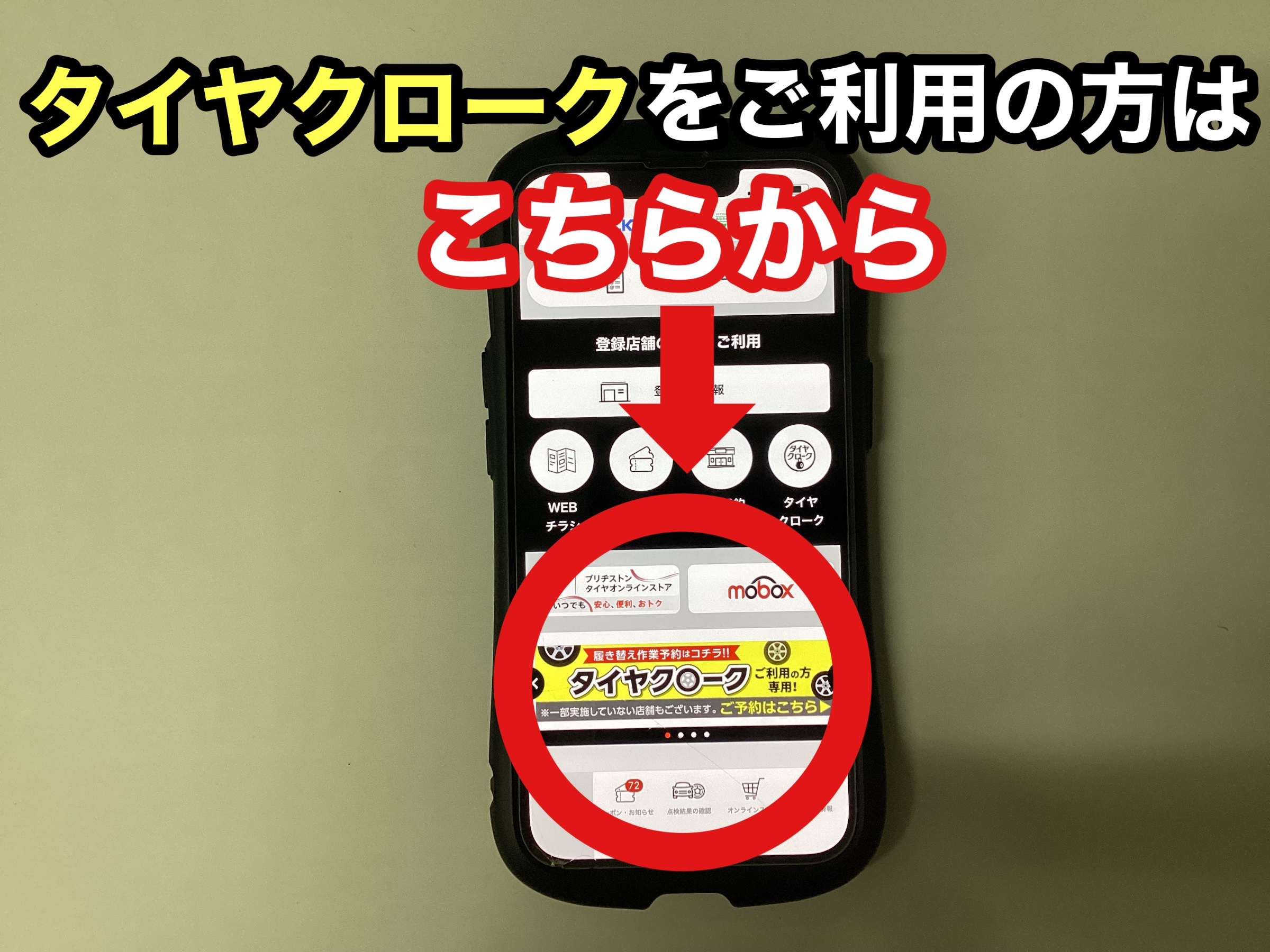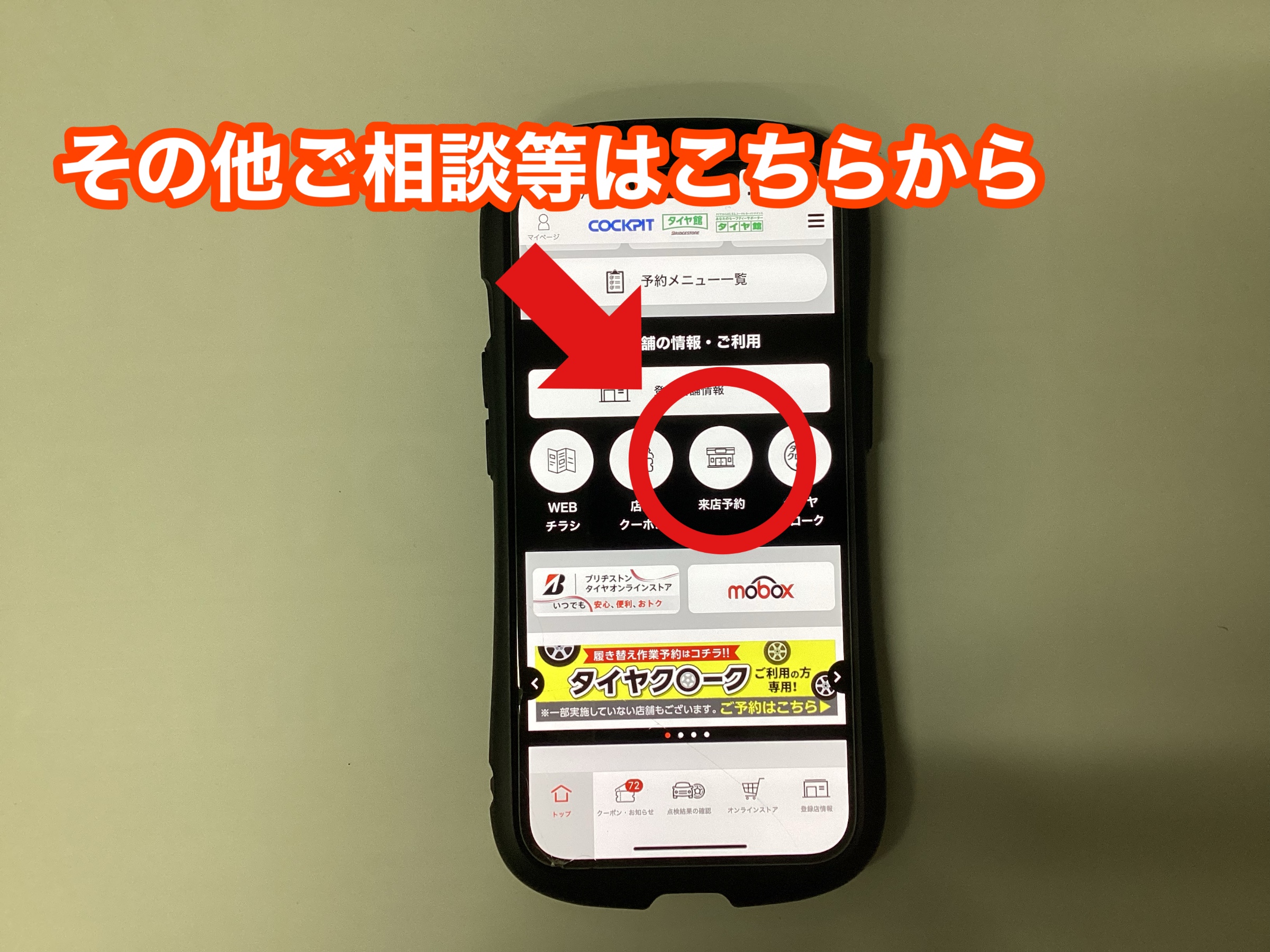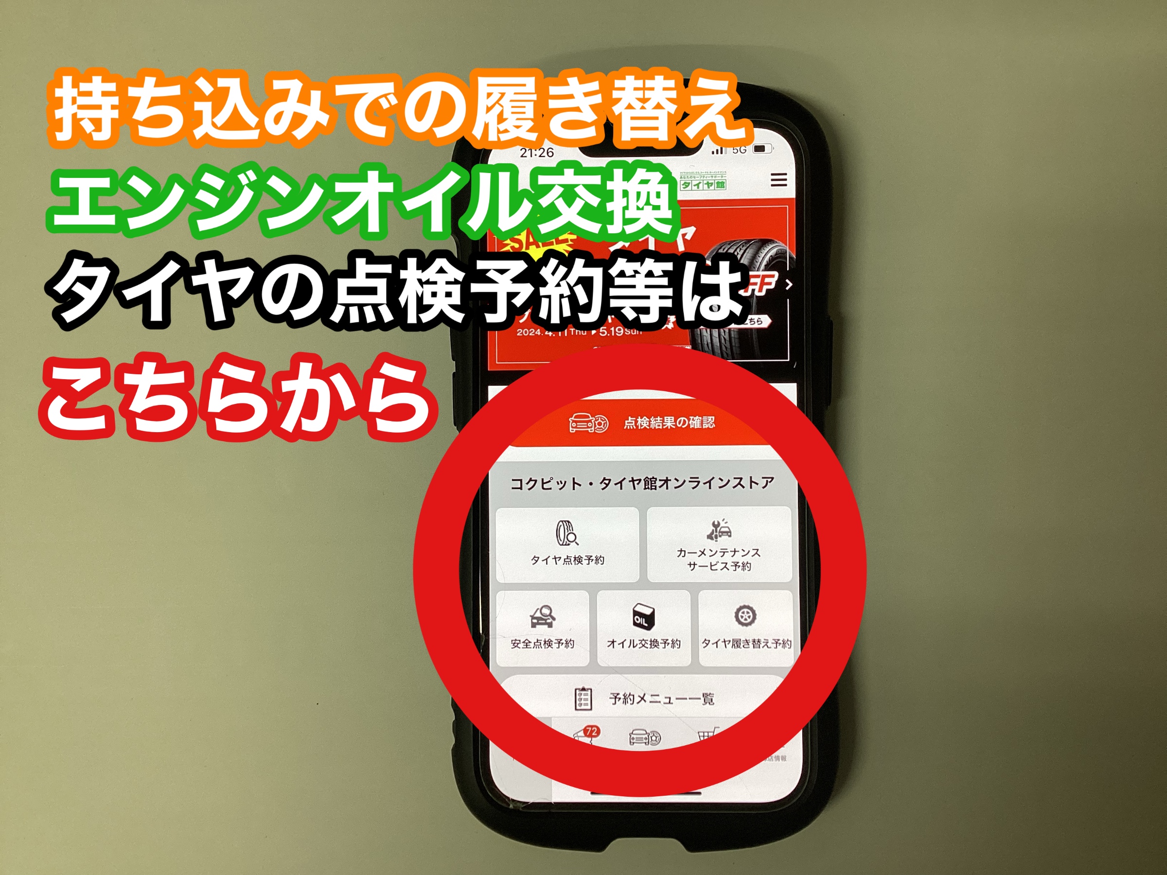 お持ち込みでのタイヤ履き替え・エンジンオイル交換・タイヤの点検予約などは赤〇からお選びください。